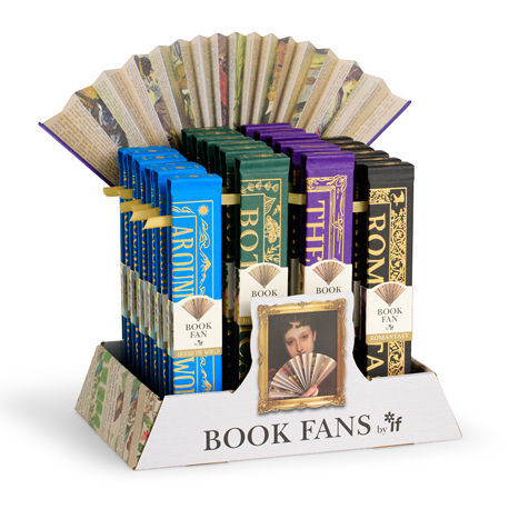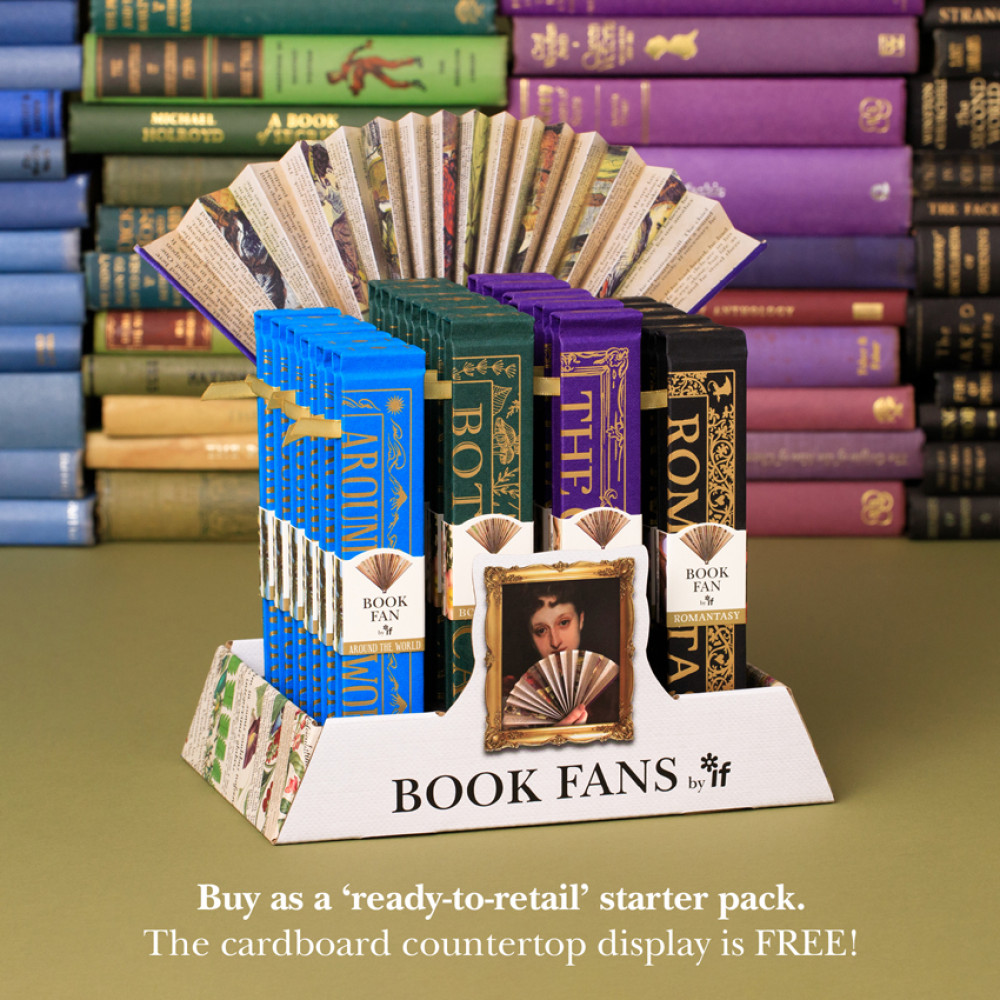 New 18cm x 3 cm bigger sized Book Fans by popular demand!NEW book fans are available in four charming themes. The perfect gift for a book fan...Exquisitely made in an authentic graphic vintage style with real Buckram cover and foiling detailBeautifully reproduced 'fake' book pages printed on excellent quality paperHang or stand in our attractive counter display