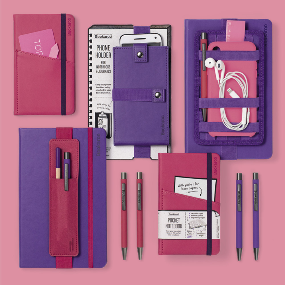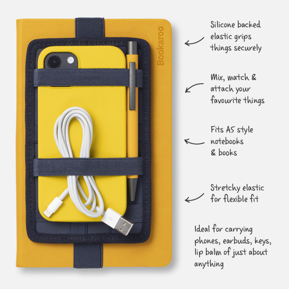 Keeps important bits tidy and handyFits A5 notebooks and popular sized booksNon-slip silicone backed elasticSuperior quality leather effect PU backerAvailable in a selection of colours