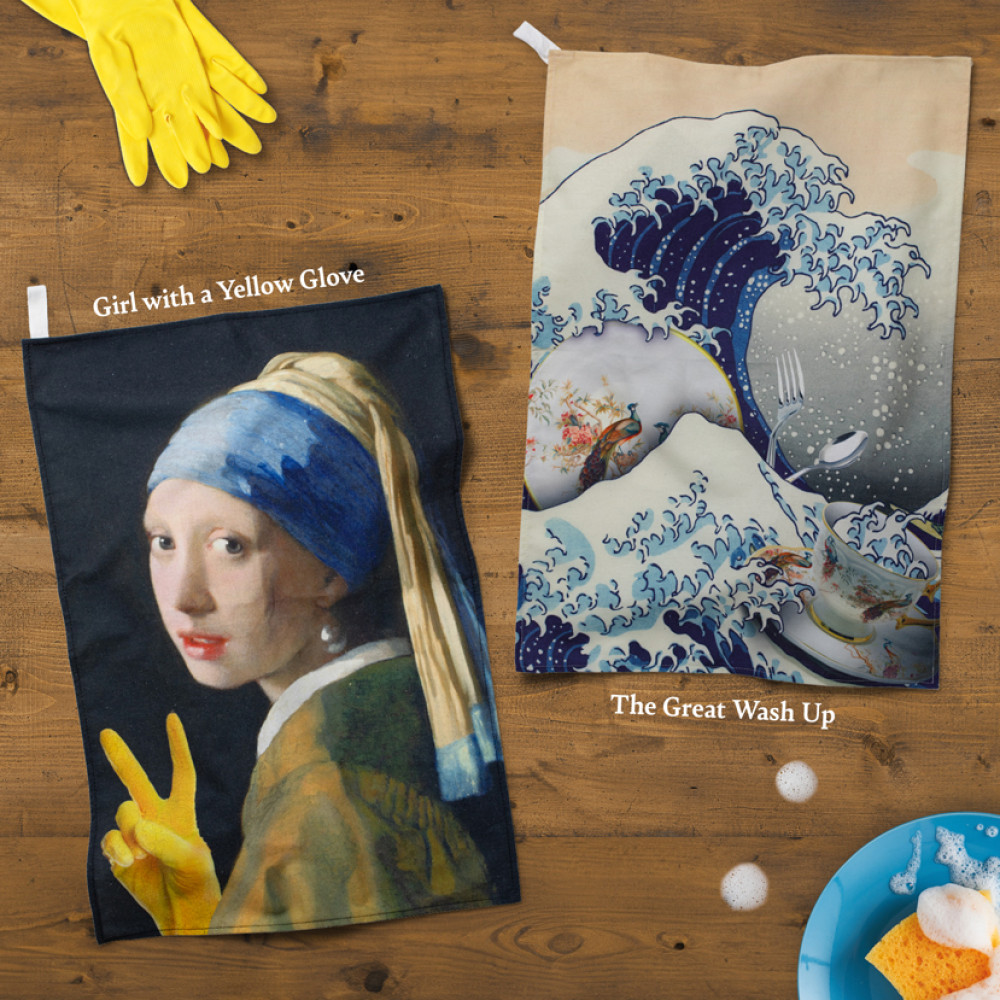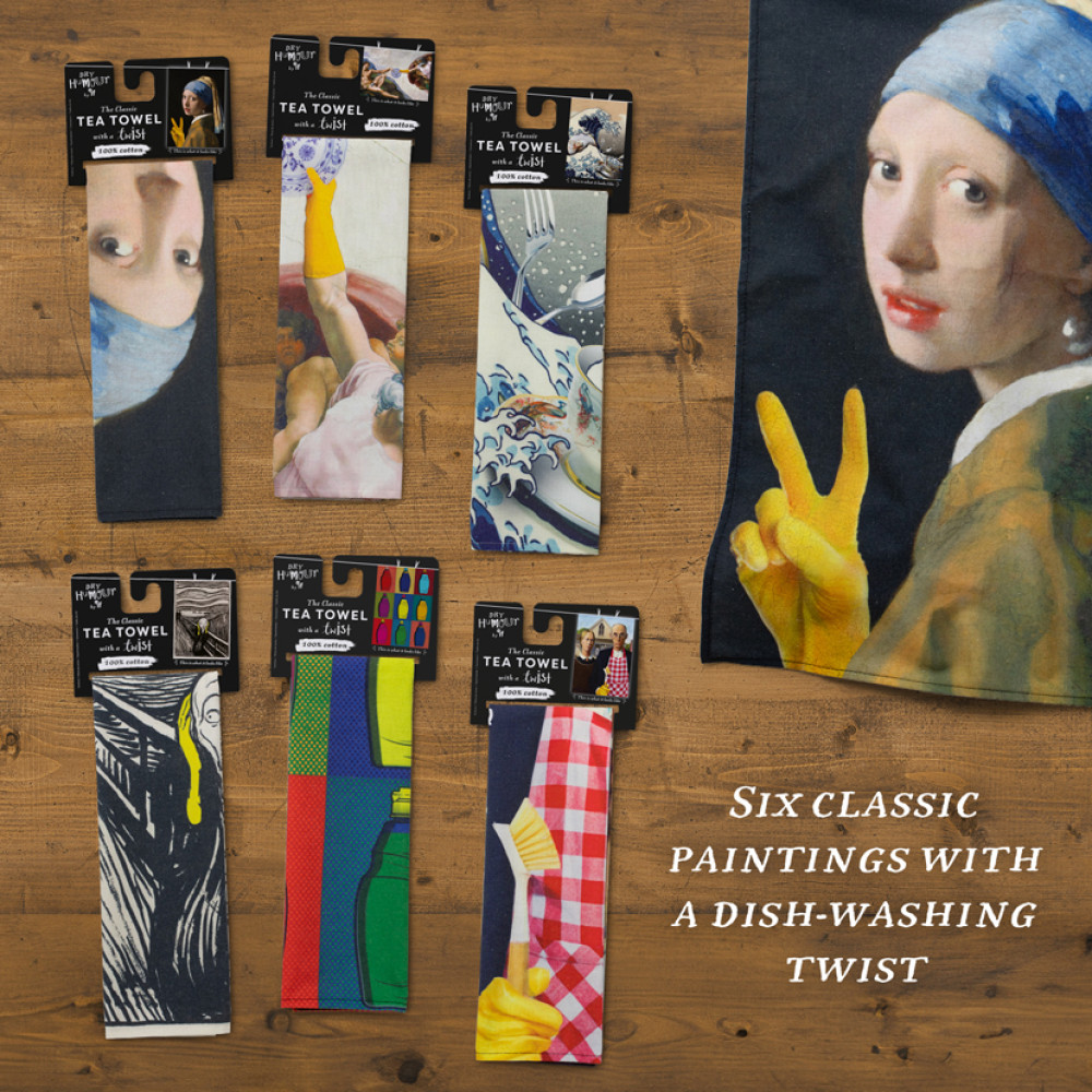 100% cotton tea towels size: 44.5 cm x 65.5 cmSix classic paintings with a dish-washing twist8oz Printed cotton soft enough to dry properlyWith the usual little hook to hang up after usePresented hanging on a card hook - see the full design