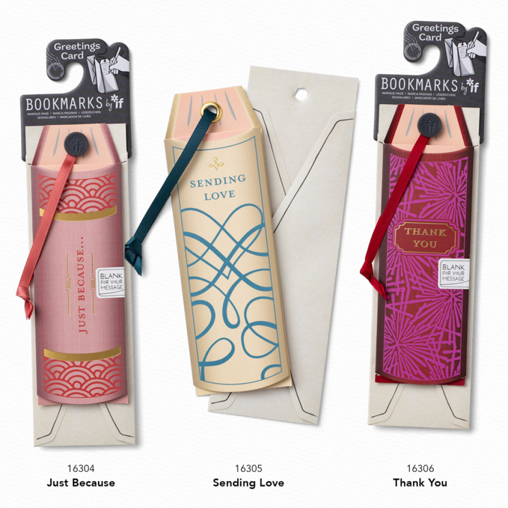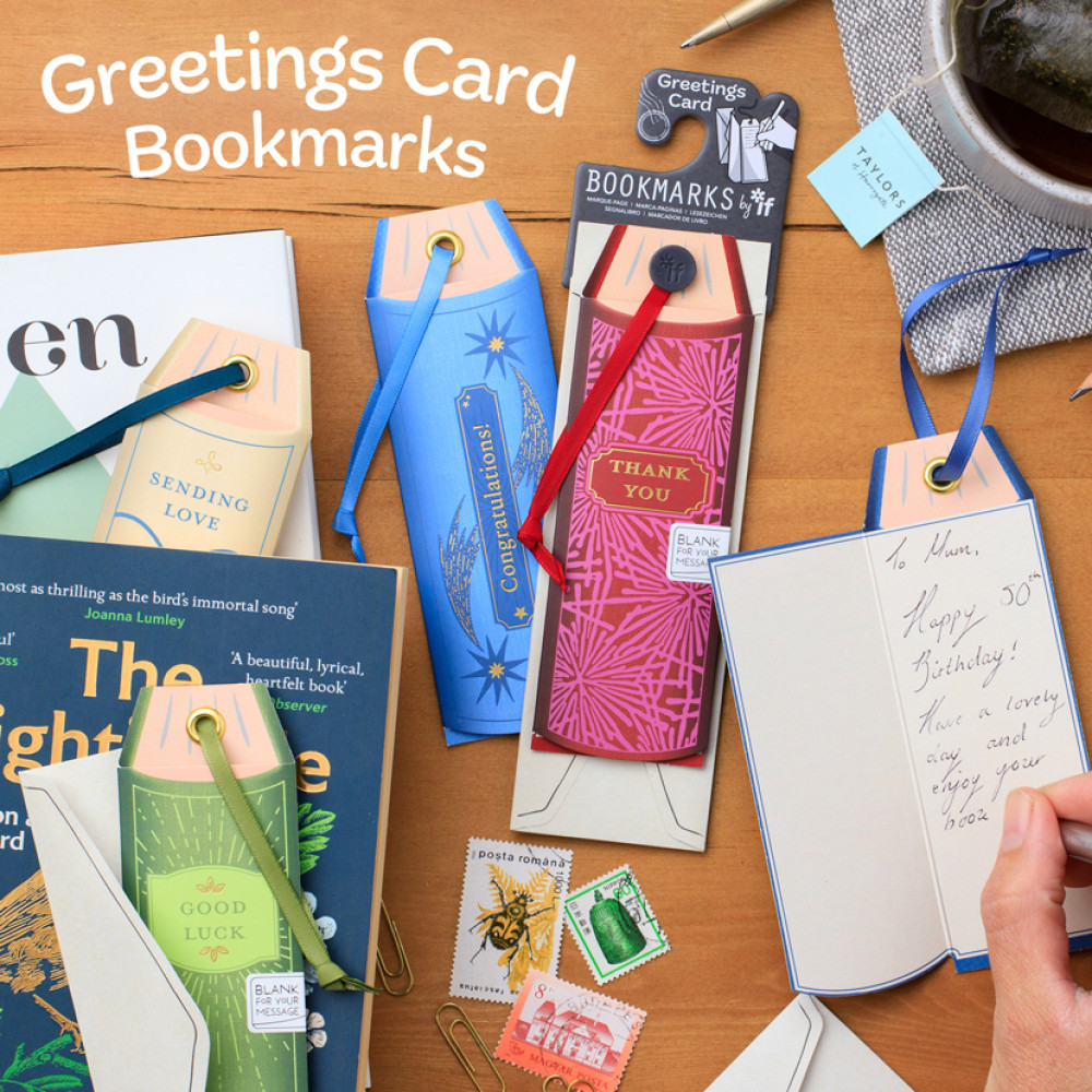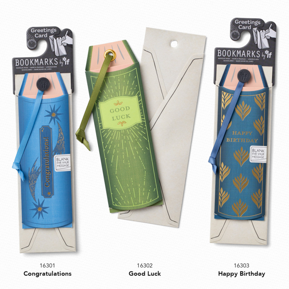 Good quality (ethically sourced) folded card, shaped like a book spineSupplied with perfectly fitting bespoke printed envelopeWith metal eyelets, grosgrain ribbon and foil detailing - just like a bookmark!Presented on a bespoke IF cardboard hangerPart of the Bookmarks By If program