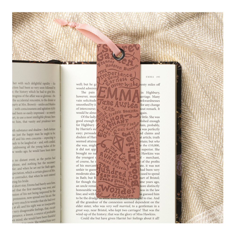 A modern and cool set of 6 illustrative typographical bookmarks. Each faux leather bookmark has an engaging curation of either book titles or bookish phrases debossed into the soft material. With matching eyelet and ribbon