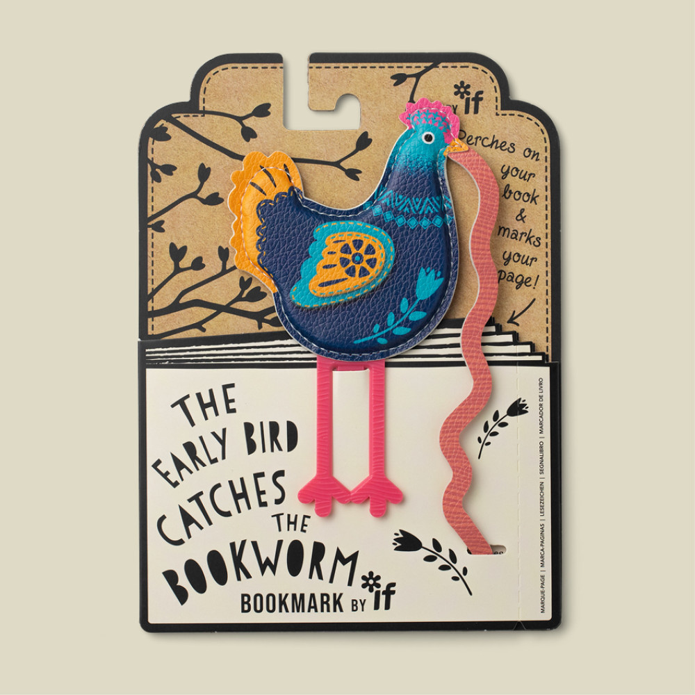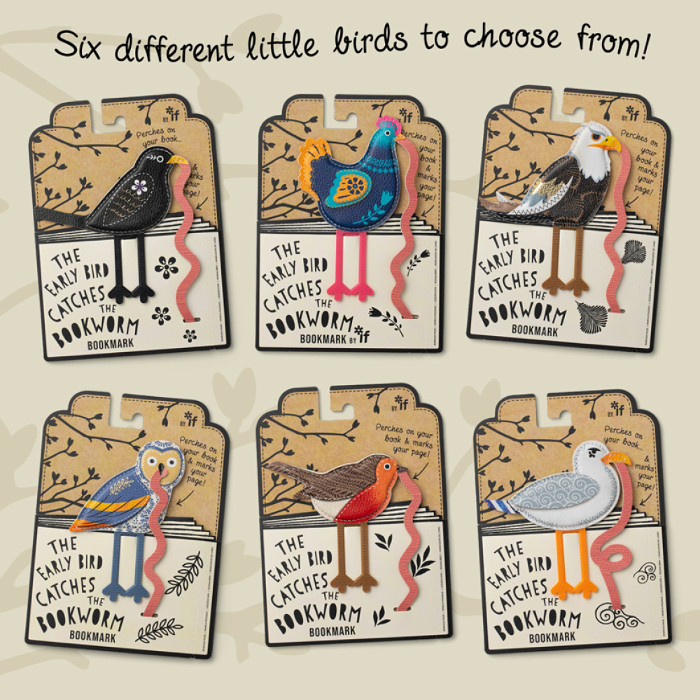 Bright coloured 'folk' style early birds with clip legs to hold on to your bookUse the dangly worm to mark your page. Great fun!Made in padded faux leather with double sided designSix different little birds to choose fromPresented in lovely gifty display packaging with a fabulous 'tree' point of sale available