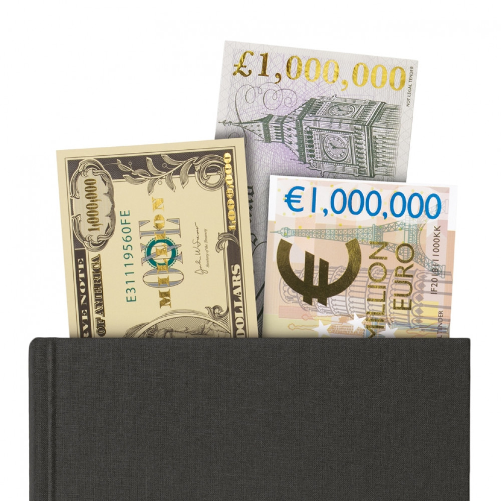 3 currency designsQuality printed paper front and backFoiled lettering on both sidesRealistic design (but not legal tender)Larger than life note size