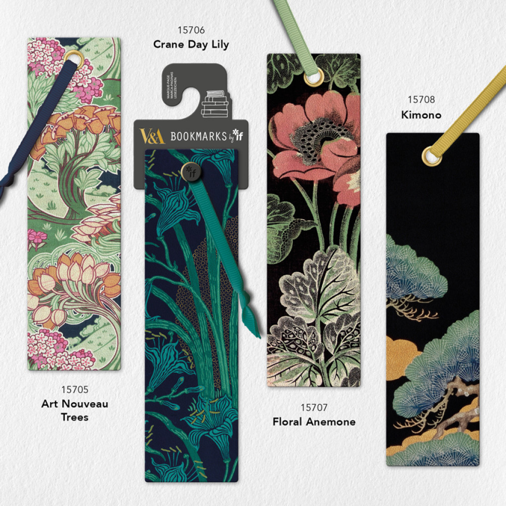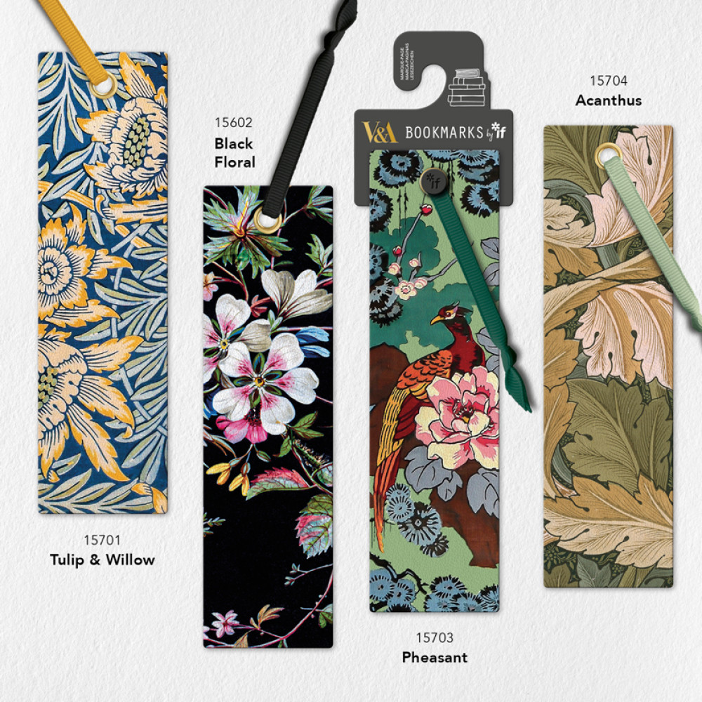 Beautifully reproduced rich, vivid V&A patterns, on superior quality faux leatherBrass eyelet and grosgrain ribbon with V&A pattern details printed on the reverseCarefully chosen subject matter to appeal to wide audienceGlobal license - no territory limitationsPresented on a special foiled V&A version of the bespoke IF cardboard bookmark hanger