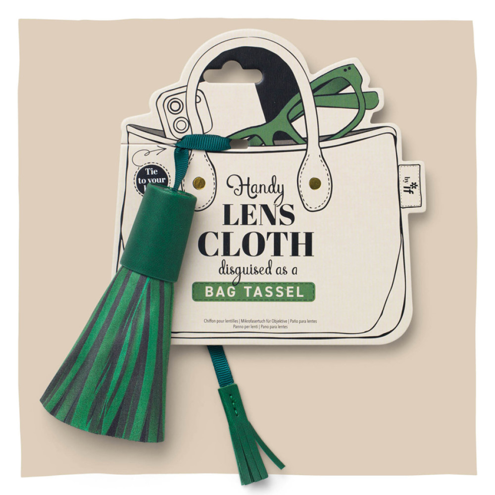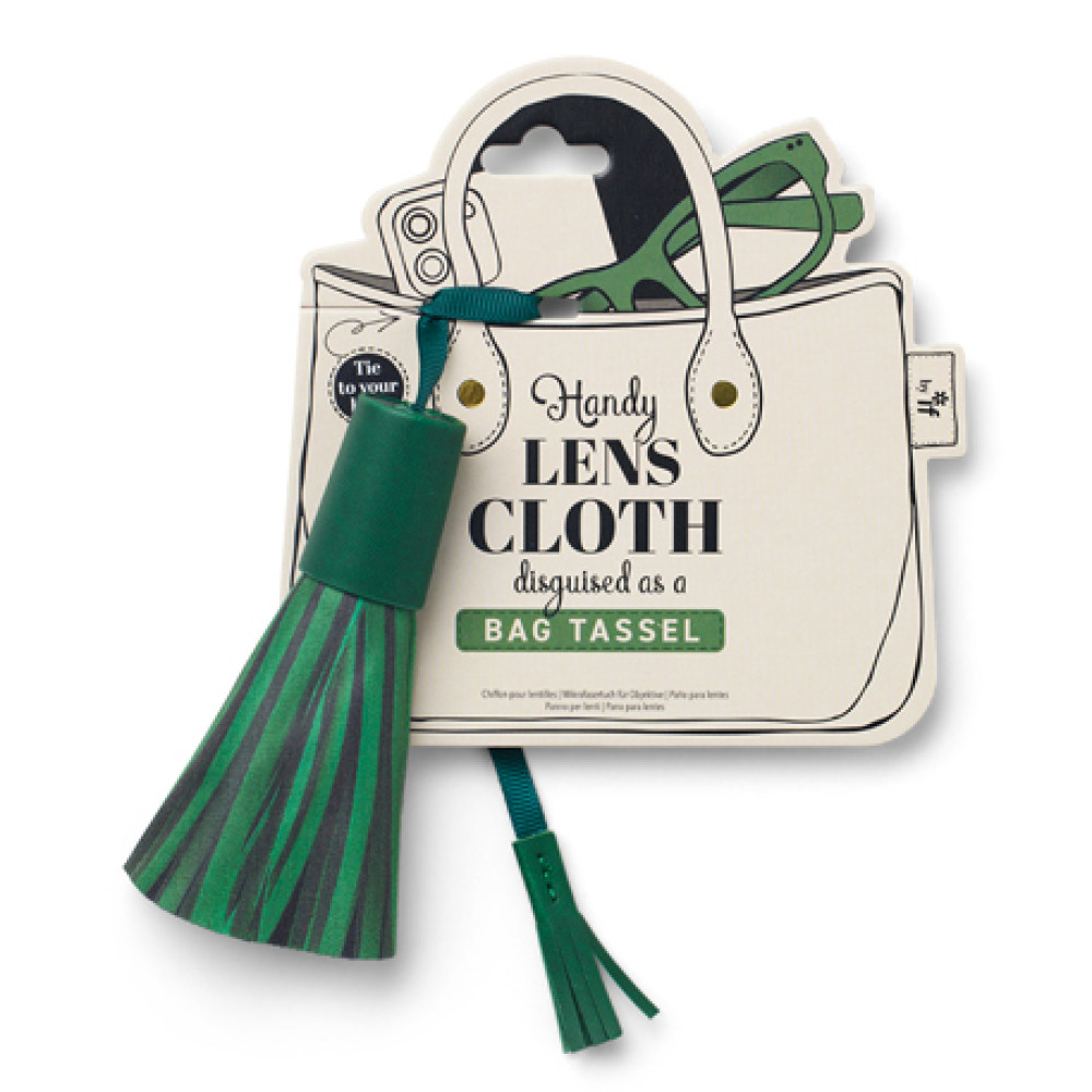 Large microfibre cloth disguised as a cool Bag Tassel CharmTie to your bag and keep your glasses and phone clean on the goJust slide the faux leather cover up to reveal the 22cm diameter round cloth - ideal for cleaning all lenses or screensSlip the cover back down and you have your stylish bag tassel backIn four popular accessory colours and presented on an attractive bag shaped hanging card