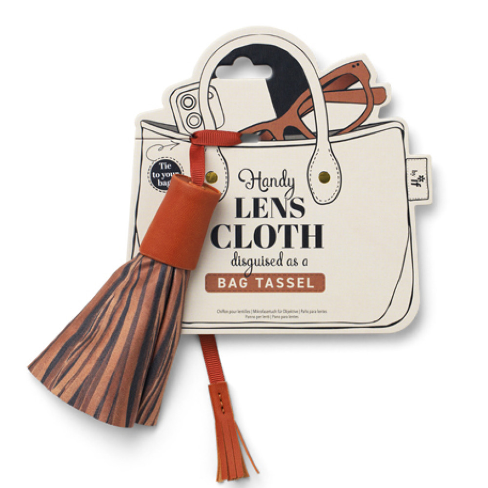 Large microfibre cloth disguised as a cool Bag Tassel CharmTie to your bag and keep your glasses and phone clean on the goJust slide the faux leather cover up to reveal the 22cm diameter round cloth - ideal for cleaning all lenses or screensSlip the cover back down and you have your stylish bag tassel backIn four popular accessory colours and presented on an attractive bag shaped hanging card