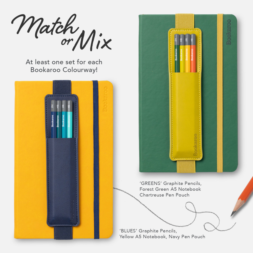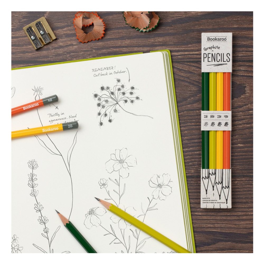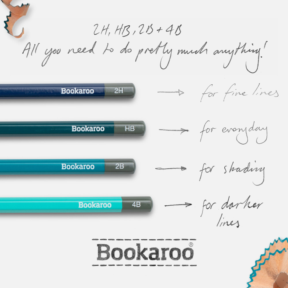 Excellent quality sets of 4 unsharpened graphite pencilsIncluding one of each weight - 2H, HB, 2B & 4B. All you need to do pretty much anything!Mix or match the coloured barrels with our Bookaroo colour sets. There's at least one to match each colourway!The essential accessory! Everyone loves a pencil. Especially in great packaging!Displays brilliantly with all our Bookaroo colour sets. It will hang or stand!