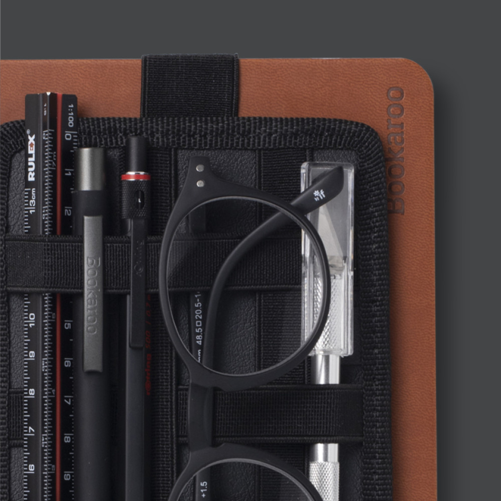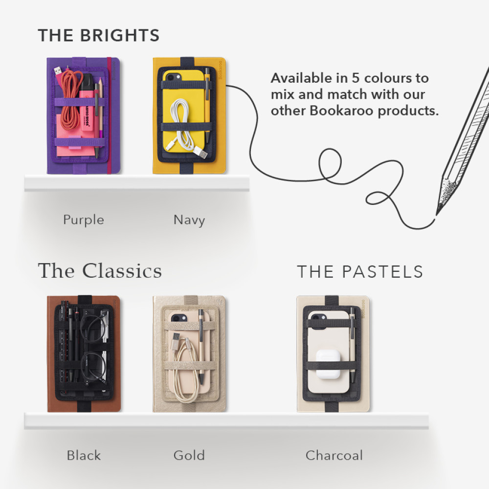 Keeps important bits tidy and handyFits A5 notebooks and popular sized booksNon-slip silicone backed elasticSuperior quality leather effect PU backerAvailable in a selection of colours