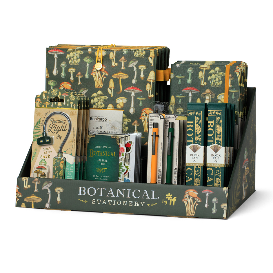 A set of 'Botanical' themed giftable stationery and lifestyle accessories. Always a strong theme for sales, this attractive vintage style fungi illustration print is especially current in interiors, fashion and gifts due to the 'Cottage Core' trend. The 'Ready to Retail' display features some of our best selling individual items, including our staple A5 hard back journal, our dinky clip-on booklight in the same theme, a 'Bigger' Book Pouch to keep your notebooks, novels and iPad safe. Now designed with expanding sides, so you can keep even more safely inside... or maybe just bigger books? With additional Bookaroo pens in a matching colour and our NEW Botanical Book Fan and Eclectionery Journal Tabs. Highly shoppable and looks great in a booky or gifty environment.