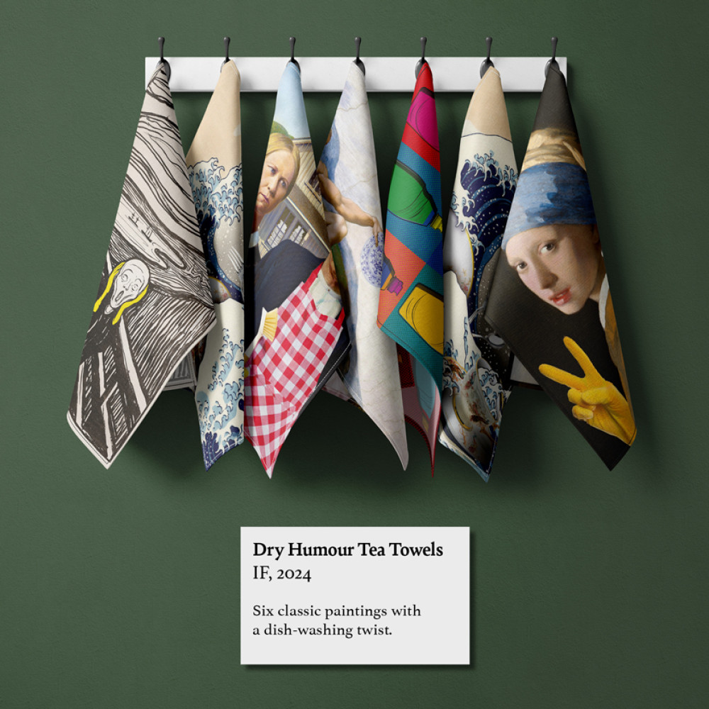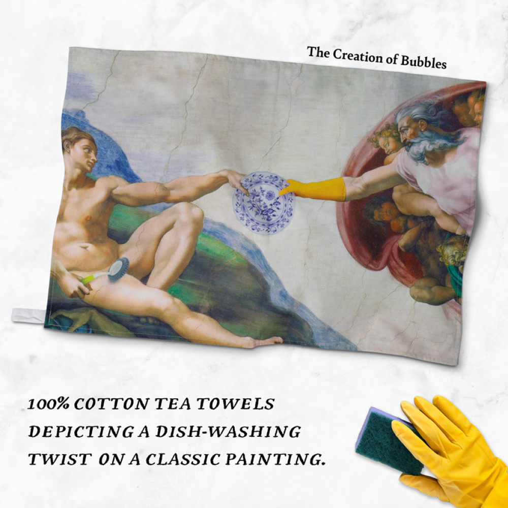 100% cotton tea towels size: 44.5 cm x 65.5 cmSix classic paintings with a dish-washing twist8oz Printed cotton soft enough to dry properlyWith the usual little hook to hang up after usePresented hanging on a card hook - see the full design