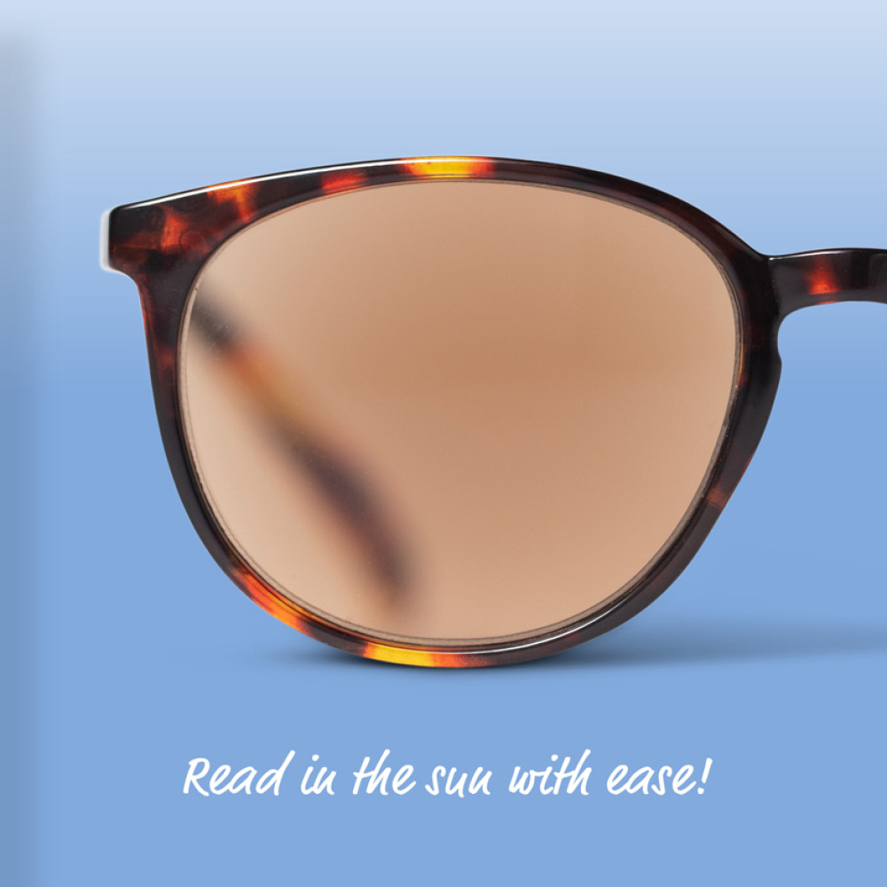 Reading glasses with tinted magnifying lenses so you can read in the sun in comfort