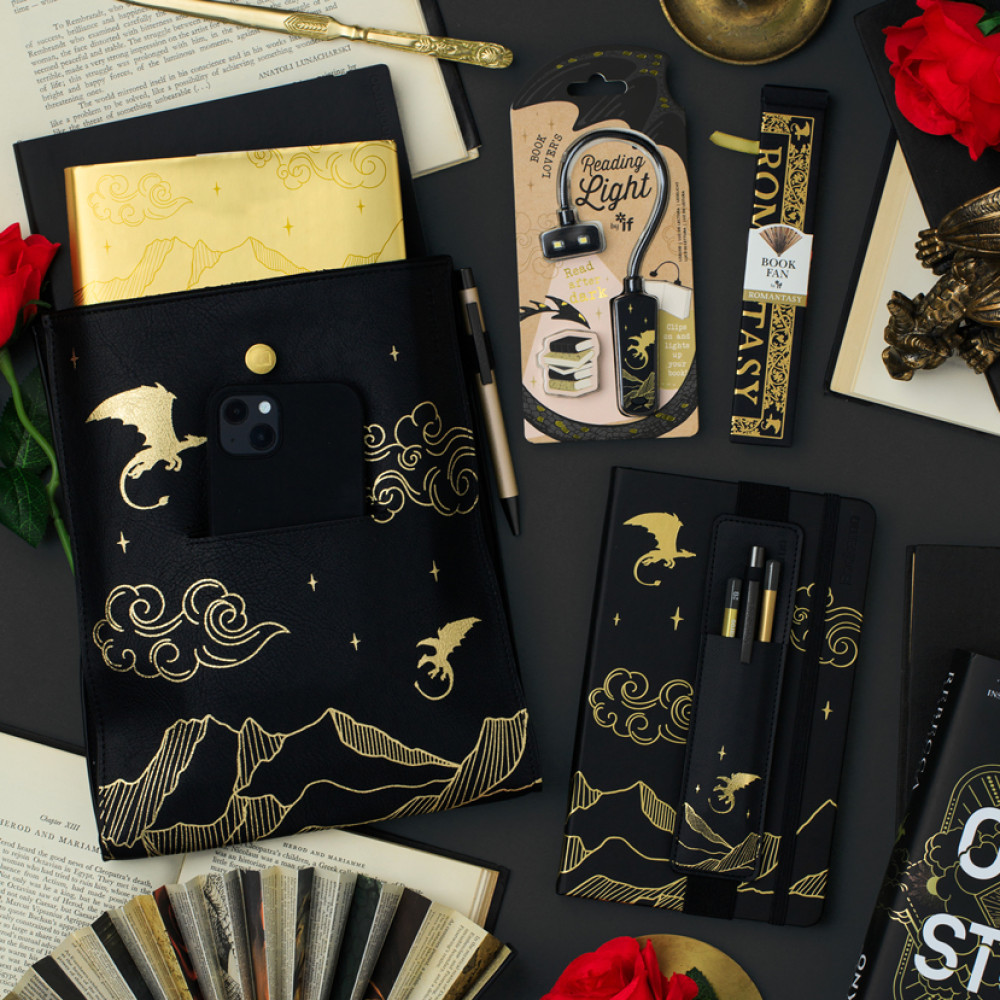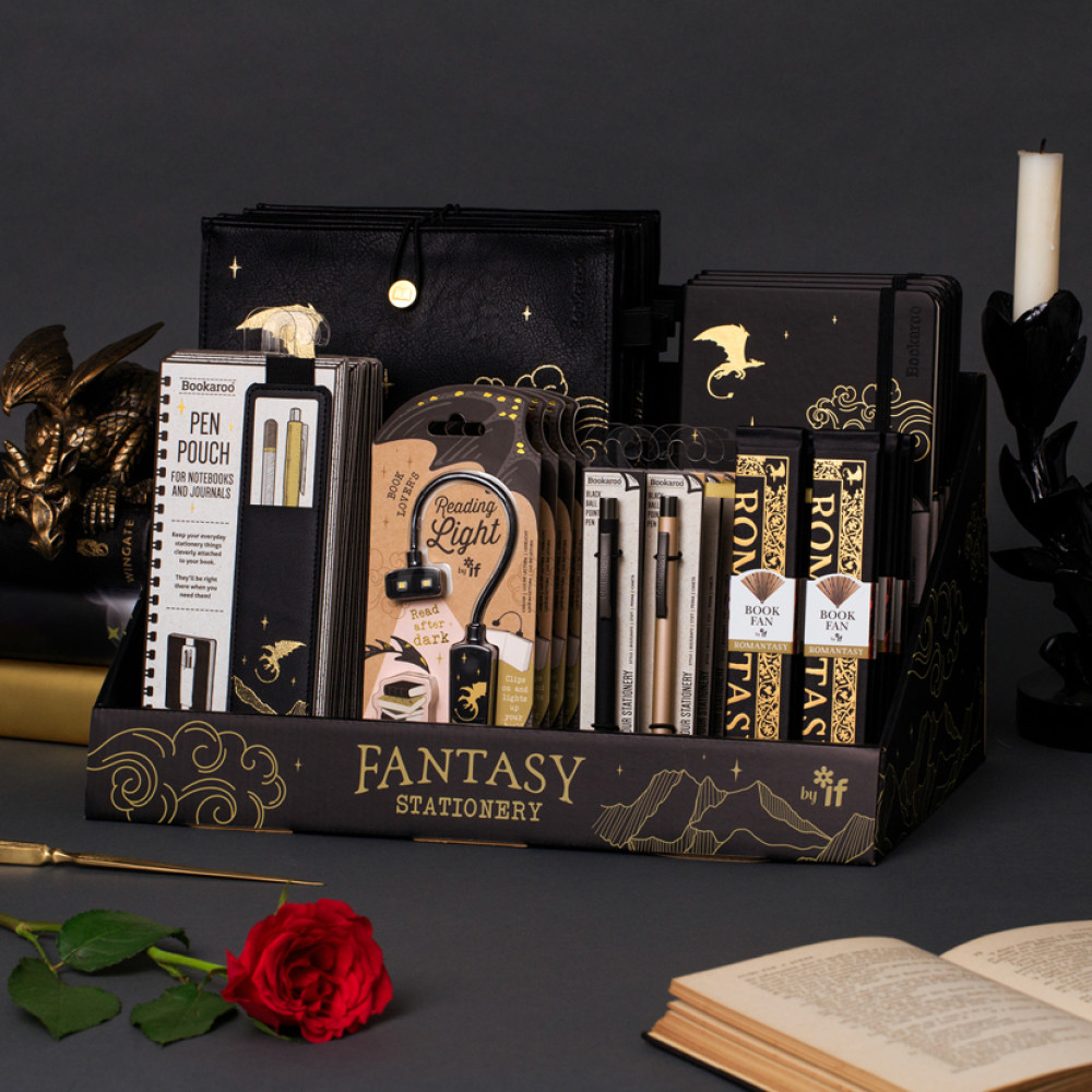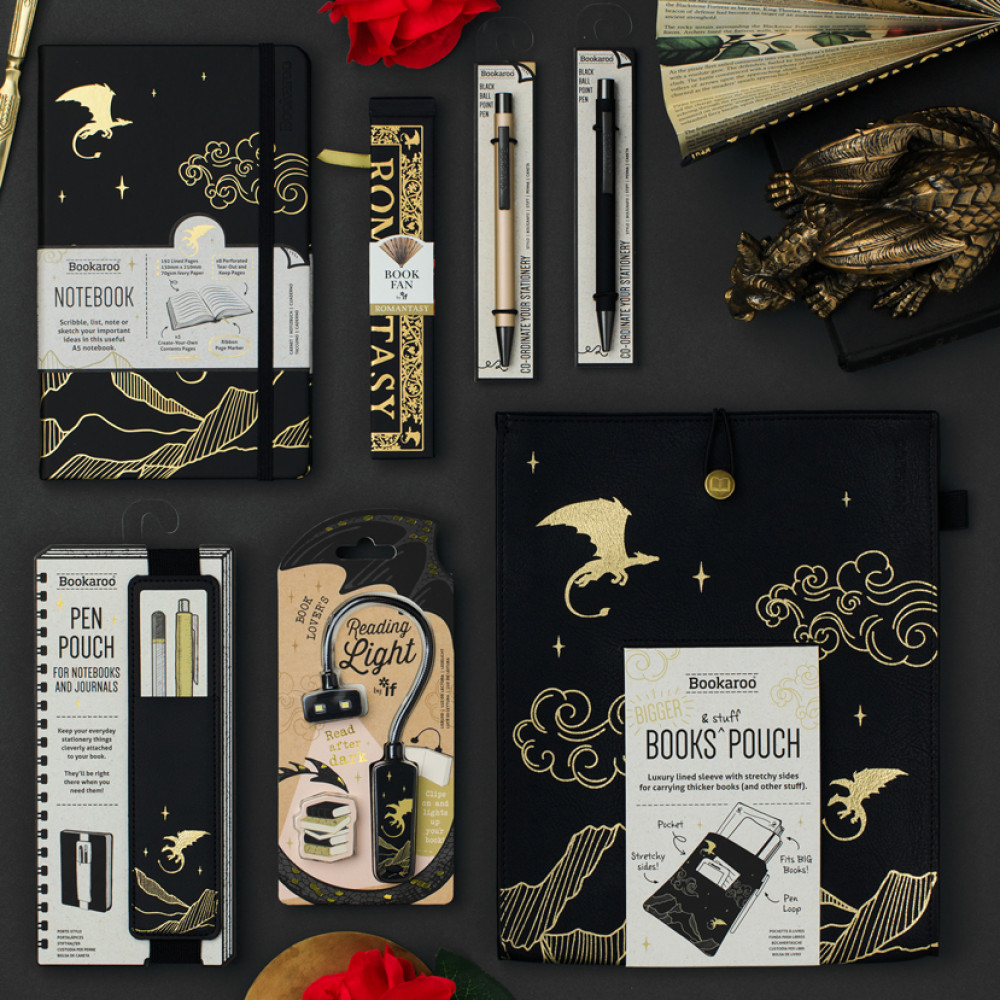 A set of themed giftable stationery and lifestyle accessories based on the current publishing phenomenon of romantic fantasy literature where magical realms & mystical creatures are the backdrop for romance. A strong theme for 2025, this very striking black with gold foil dragon & mystical landscape image is an especially current theme in literary, interiors, fashion and gift. This 'Ready to Retail' display features some of our best selling individual items, including our staple A5 hard back journal, our dinky clip-on booklight in the same theme, a 'Bigger' Book Pouch to keep your notebooks, novels and iPad safe. Now designed with expanding sides, so you can keep even more safely inside... or maybe just bigger books? With additional Bookaroo pens in a matching colour, Pen Pouch and our NEW Romantasy Book Fan. Highly shoppable and looks great in a booky or gifty environment.