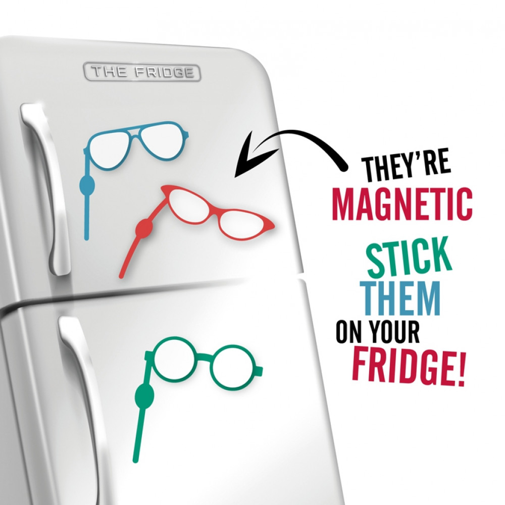 2x magnification lenses for small printThey stick on fridge with hidden magnetsWorks for both right and left handersHand held - fun and practical3 fun frame styles available