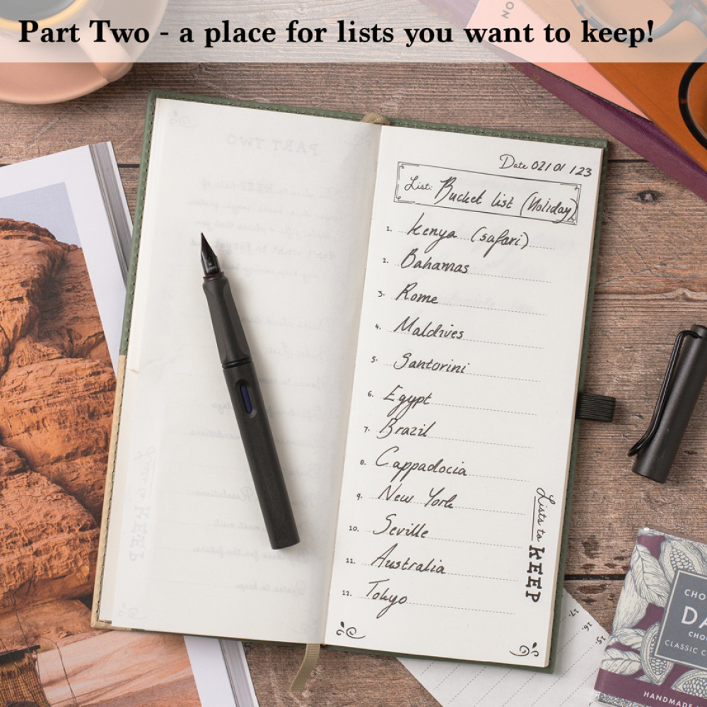 One lovely book for two types of listsPart one is perforated for tear out lists. Part two is bound in to keep!Good quality 70gsm creamy paper & faux leather bound hard coverIndexed pages, elastic decorative closure, ribbon marker, stitch detailing, pen loopPart of the Journals for Life by IF collection