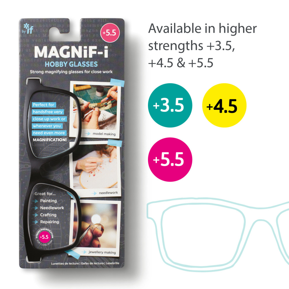 High quality tested frames and lensesAvailable in higher strengths +3.5, +4.5, +5.5Comfortable frames with sprung hinges and large lense areasGreat for any close up work including repairing, needlework, jewellery making or paintingA new addition to our Magnif-i - a smart, co-ordinated range of well designed, good quality magnifying products for everyday use