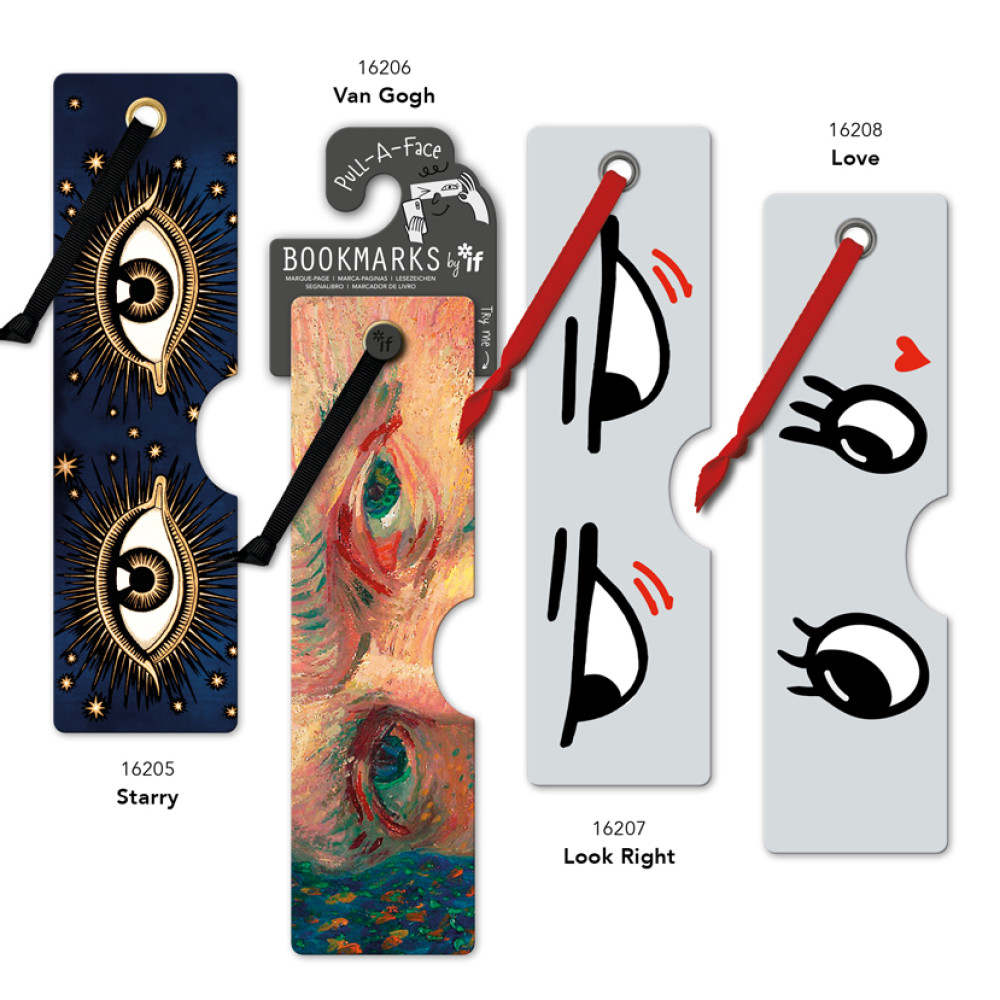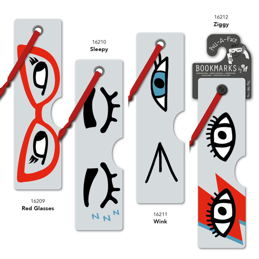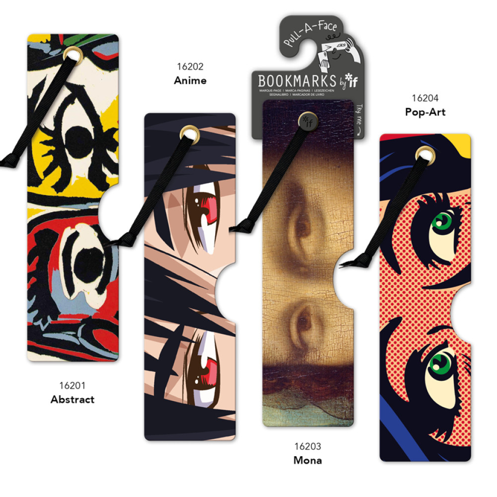 A collection of twelve designs - 6 'classic' portrait and 6 illustrative double sided designsUnique die-cut double sided 'eye' and 'mouth' designsReproduced on good quality thick ethically sourced board with metal eyelets and quality grosgrain ribbonPresented on a bespoke IF cardboard hangerPart of the Bookmarks By If program