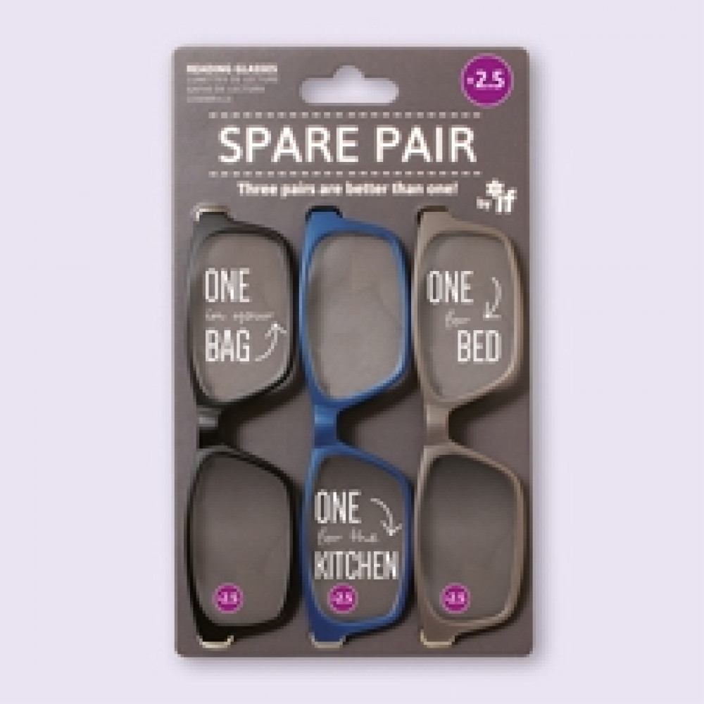 This really does exactly what it says on the tin... a set of three pairs of reading glasses (all the same strength) to keep in three of the places where you might need glasses... in the kitchen, garage, handbag, the office, in the car, the bedroom... or somewhere slightly more obscure. If you need reading glasses, or know someone who can't live without them, you'll need Spare Pair!