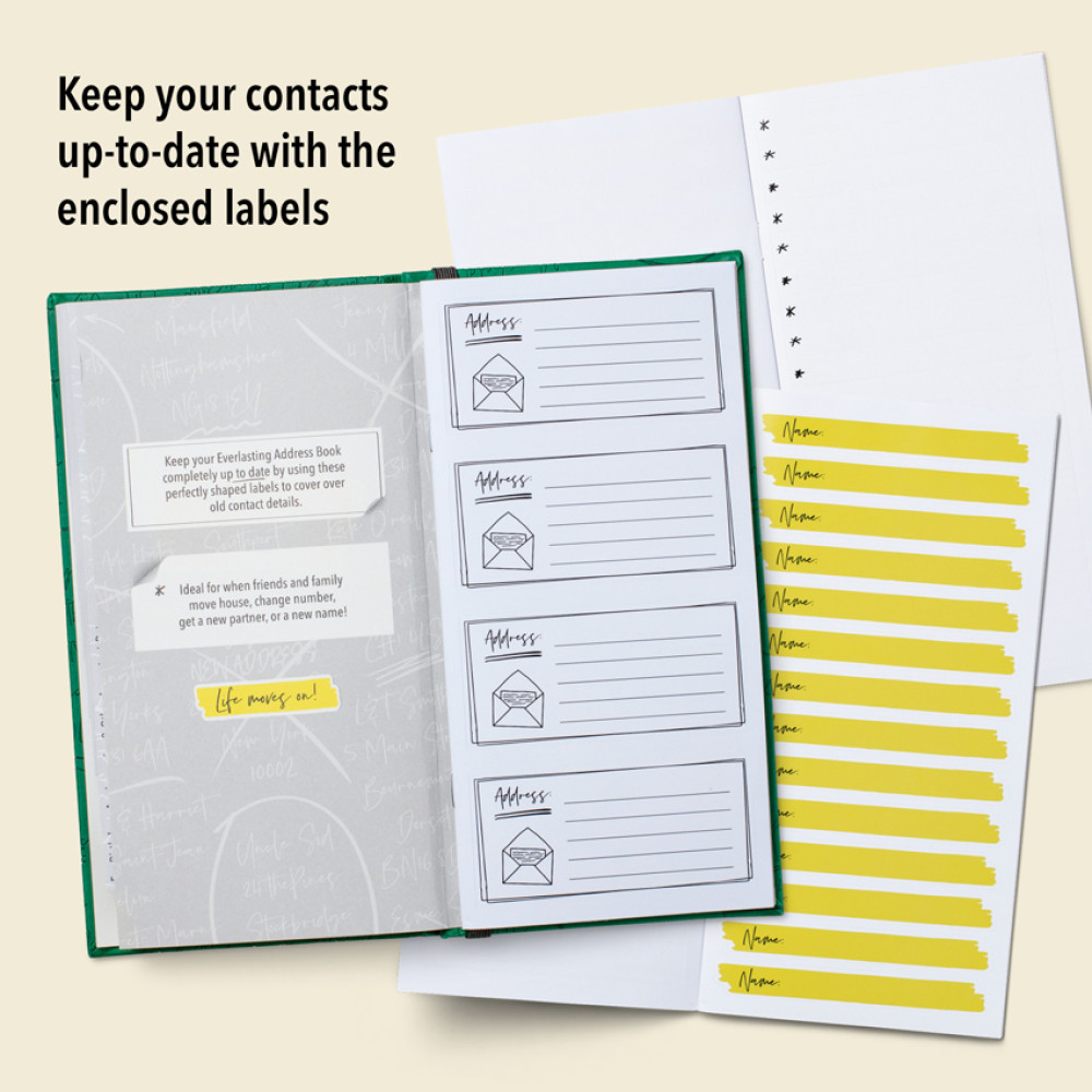 Who doesn't own an untidy, scribbly, difficult to decipher, paper stuffed address book? The Everlasting Address Book with its beautifully indexed alphabetised and useful 'sections' is a thing to be proud of. And why is it 'everlasting'? Well, when family move house, change their number, their partner or even their name, you simply use the perfectly shaped adhesive labels to cover over old details and rewrite the new ones. No scribbles. No running out of space. No sending cards to the wrong address (and wrong name) for years! Be the envy of your friends!