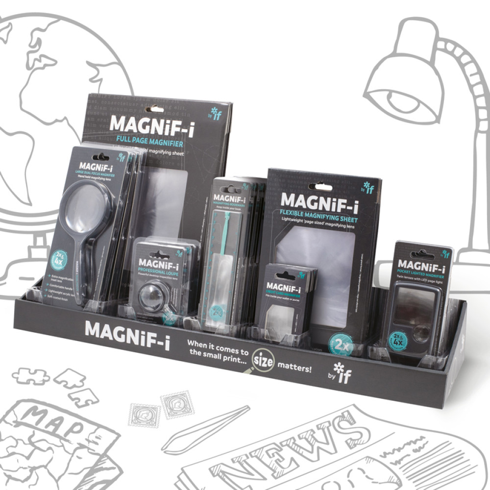 Ideal for Pharmacies, Book Shops and Gift Shops, our smart co-ordinated range of well designed magnifying products provide magnifying solutions for every day use. These products sell very well to us over 50s, whether it's for hobbies, DIY, reading the menu or just checking the 'use by' date on those tins at the back of the cupboard!