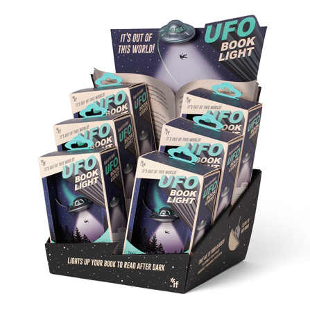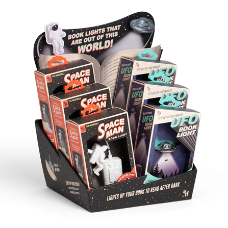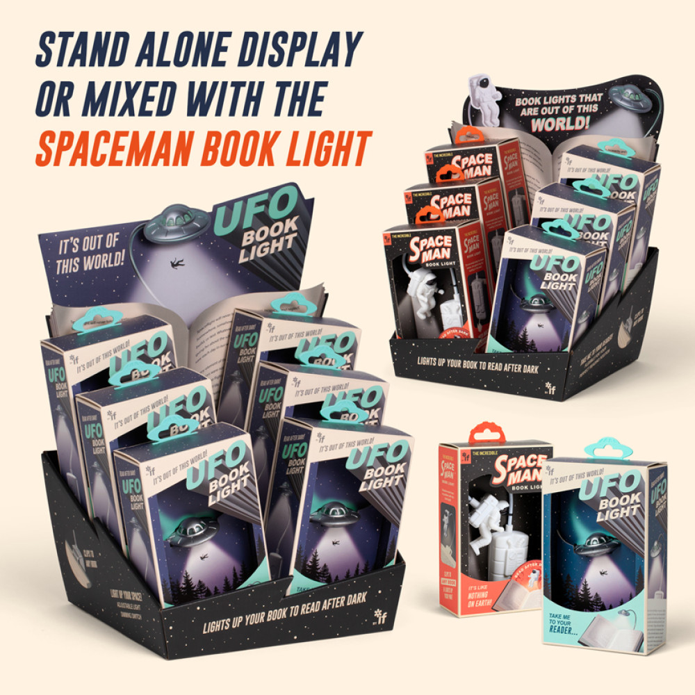 No need to visit Area 51 to grab yourself an alien light source! This 3D UFO spacecraft is fuelled by 3 x AAA batteries for a longer life so it won't leave you out in the dark. Clip your 'mothership' control panel to any book and this 'out of this world' light (with 3 LEDs) will cast a light beam down onto your page, so you can carry on reading after dark. In a really cool retro style all-cardboard display box with moulded 'UFO' shaped hook and available with an earthling counter top display. Take me to your reader!