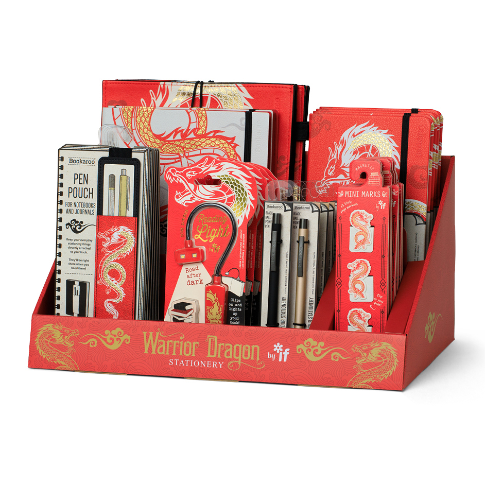 A set of themed giftable stationery and lifestyle accessories featuring a vivid and fabulous Chinese Dragon motif. A strong and distinct look in bright red with gold foiling. This 'Ready to Retail' display features some of our best selling individual items, including our staple A5 hard back journal, Bigger Things Journal (with printed page edges), our dinky clip-on booklight in the same theme, a 'Bigger' Book Pouch to keep your notebooks, novels and iPad safe. Now designed with expanding sides, so you can keep even more safely inside... or maybe just bigger books? With additional Bookaroo pens in a matching colour, Pen Pouch and our NEW Mini Marks. Highly shoppable and looks great in a booky or gifty environment.